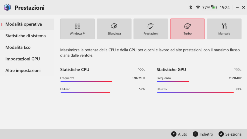 Lato autonomia, ASUS ha inserito una batteria da 60Wh la cui durata dipende, naturalmente, dal profilo energetico che decidiamo di impostare. Giocando a titoli tripla A in modalità Turbo a 25W o 30W, con luminosità alta e ventole al massimo, la console si spegnerà inesorabilmente dopo circa un’ora e mezza. Abbassando il tiro e giocando a titoli mediamente impegnativi in modalità Prestazioni (15W), sono riuscito a sfiorare le tre ore. Il vero miracolo si compie in modalità Silenziosa (10W), ideale per un utilizzo prolungato fuori casa con giochi 2D molto leggeri, per guardare una serie o  per il cloud gaming, con cui ho superato anche le quattro ore e mezza di schermo acceso.