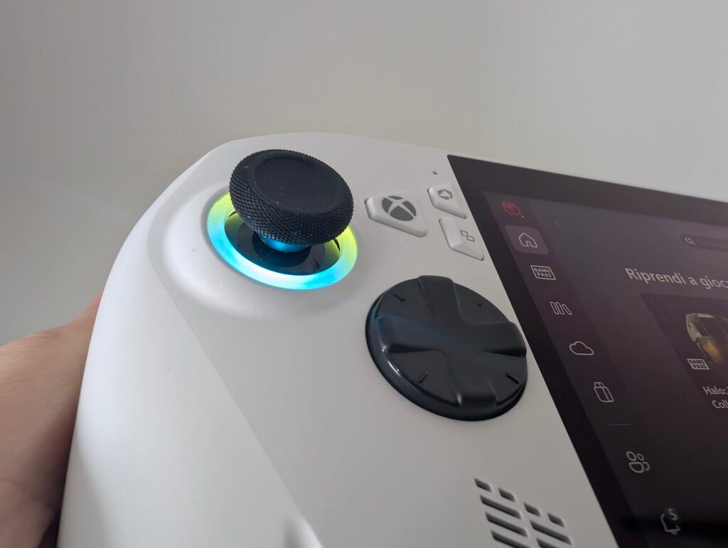 Appena tirata fuori dalla scatola la console mi ha piacevolmente stupito per la sua ergonomia e l’ottimo bilanciamento dei circa 640g di peso, che la rendono decisamente piacevole anche dopo sessioni prolungate. Le impugnature sagomate riempiono bene i palmi delle mani, la texture ruvida favorisce un’impugnatura ben salda e nulla si può dire riguardo la qualità costruttiva. Il layout dei pulsanti è quello di un controller Xbox e se siete abituati a questa piattaforma vi sentirete immediatamente a casa: i tasti ABXY restituiscono un feedback tattile secco e preciso, i grilletti posteriori, posizionati esattamente all’altezza delle dita medie, hanno un’ottima corsa, mentre delle levette analogiche, asimmetriche come da tradizione Microsoft, ho apprezzato la zigrinatura laterale per impedire ai pollici di scivolare.