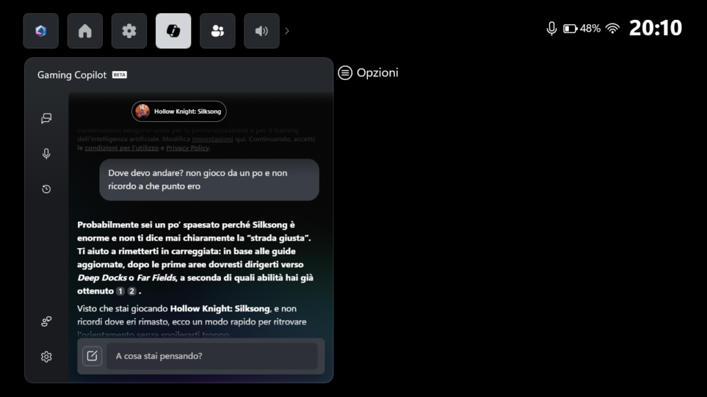 Un discorso a parte va fatto per Windows 11. Da un lato si tratta di una piattaforma estremamente versatile che permette di installare qualunque programma vi venga in mente, non soltanto per il gaming: suite Office, app di messaggistica, browser personalizzati e chi più ne ha più ne metta; ho trovato molto interessante l’integrazione con Copilot, molto preciso nel riconoscere i giochi in riproduzione e dare consigli basandosi sui dati disponibili online, anche se purtroppo non è ancora in grado di identificare in che punto del gioco ci troviamo.