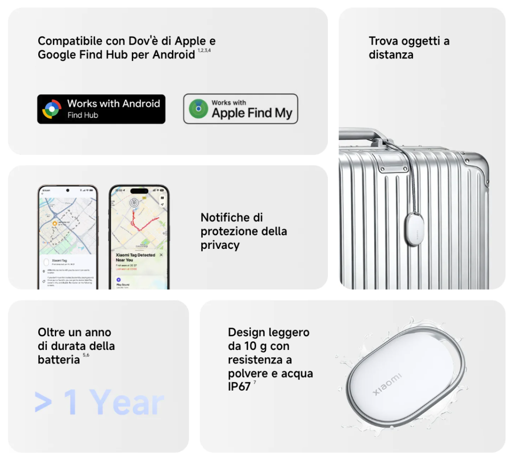 Lo Xiaomi Tag supporta sia la rete Apple Find My sia la rete Google Find Hub. Tuttavia, le due opzioni non possono essere utilizzate contemporaneamente: al momento della configurazione iniziale occorre scegliere una delle due reti. Questa flessibilità permette al dispositivo di integrarsi con gli ecosistemi dei due principali sistemi operativi mobile.